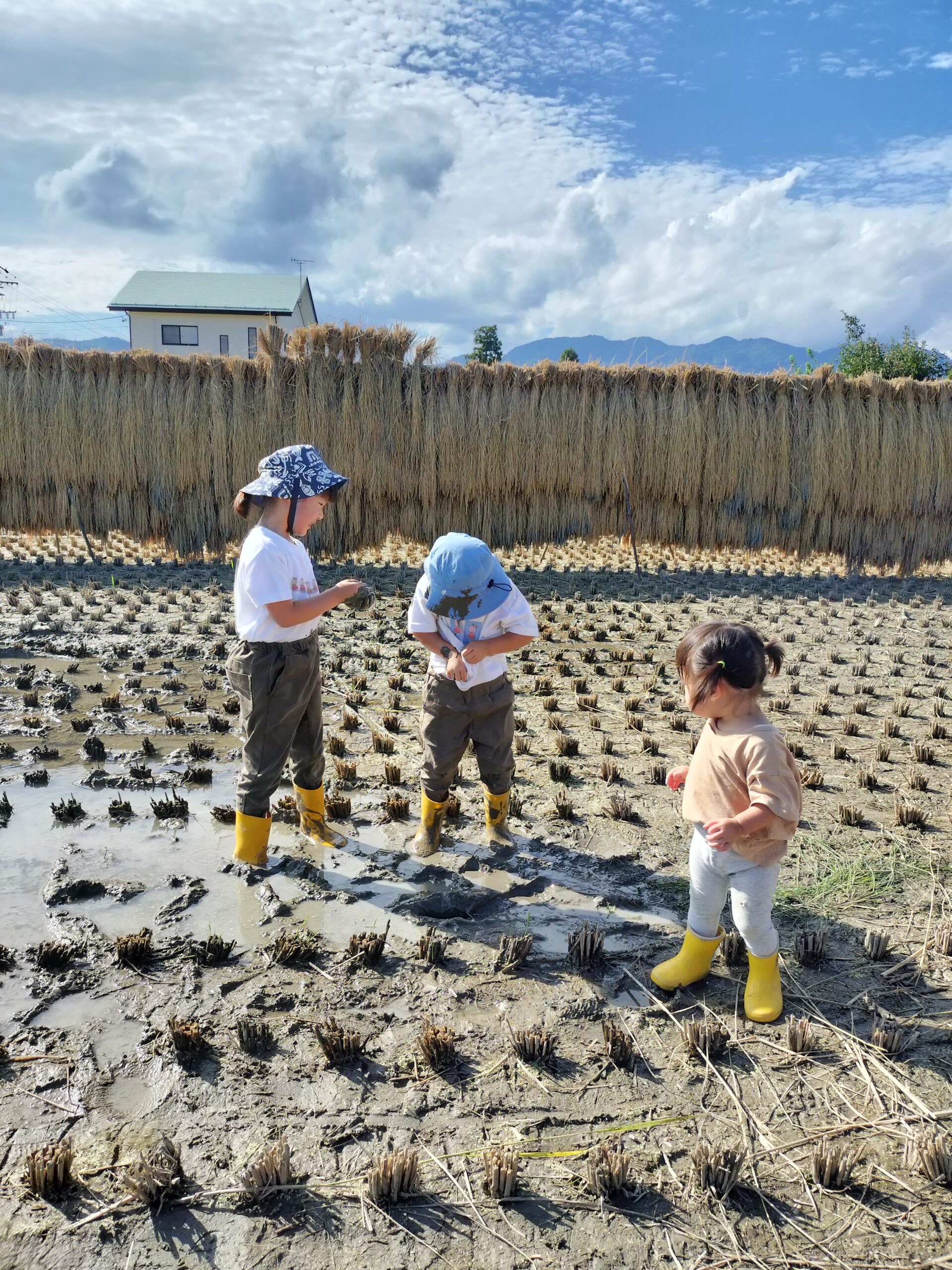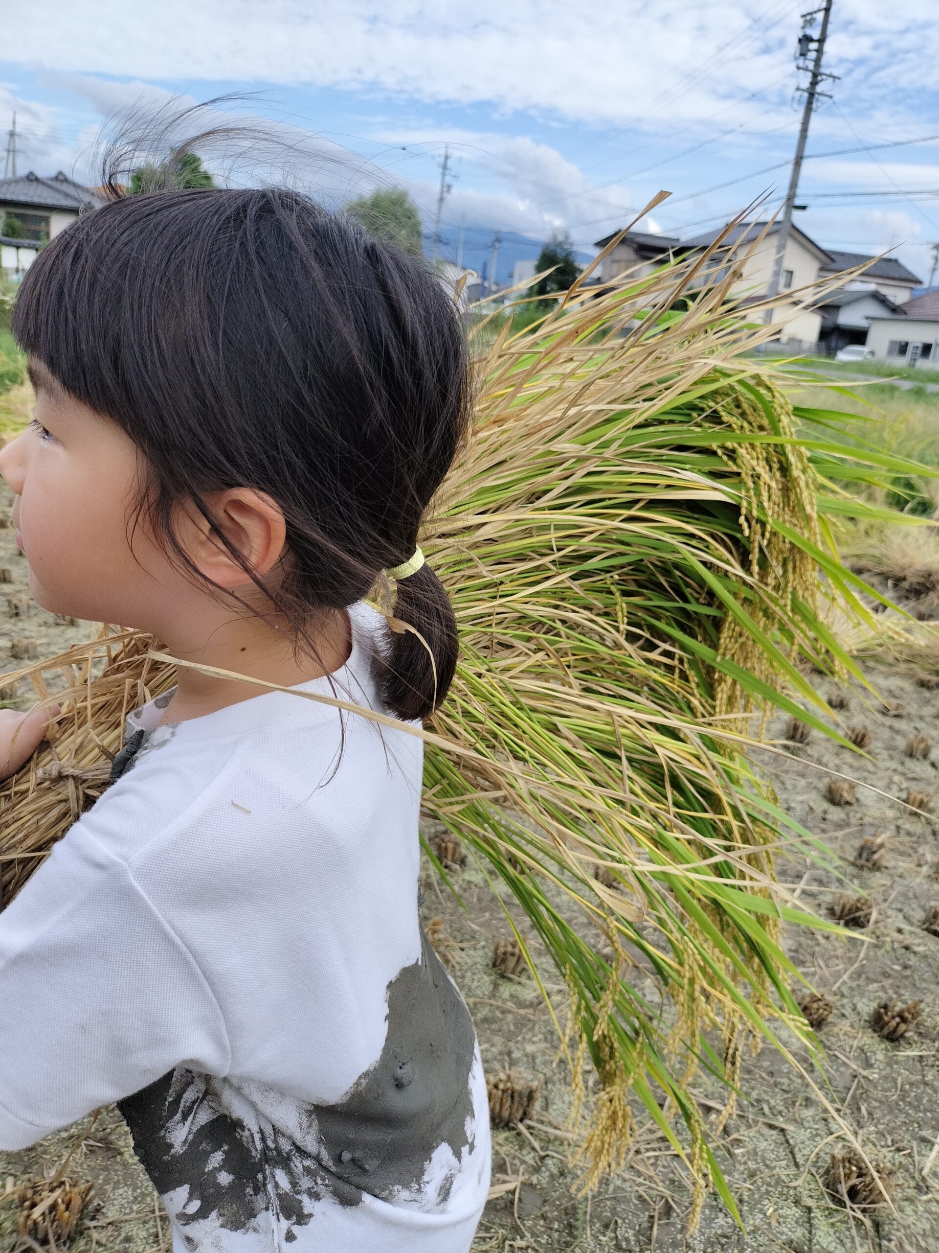 休みの日には子どもたちも一緒に参加し、刈り取られた稲を運んでくれたり、カエルを追いかけたり、泥まみれになったり、それぞれに楽しんでいる様子で一緒に作業できてよかったです♪
