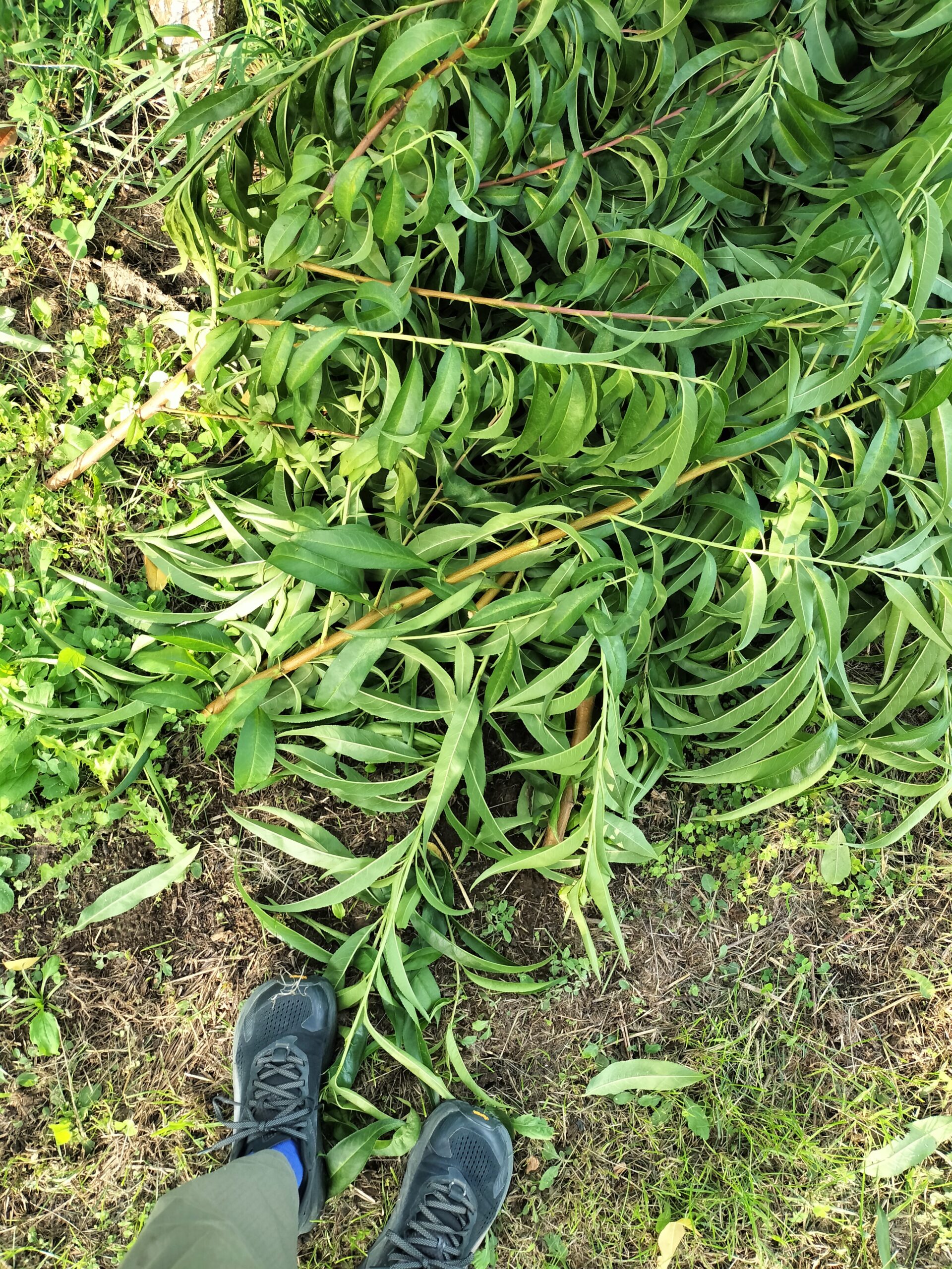 お礼肥は、おいしい桃を成らせてくれた樹々に感謝を込めて、消耗した栄養を回復させるために与えます。秋季剪定は、樹勢を落ち着かせるために暴れん坊の元気な枝を切り落とします。秋の剪定は、冬の丸坊主な枝と違ってまだ葉っぱが残っているので、日の当たり具合が目に見えて分かりやりやすい!!