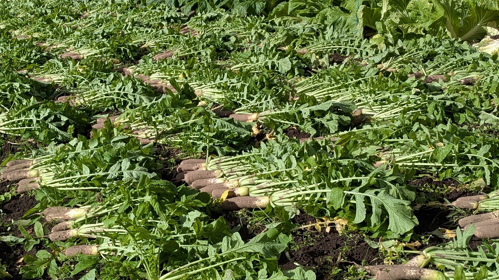 戸隠大根を収穫しました。種を蒔いたのが9月8日、収穫までは例年だと2か月程度ですが、秋の気候が暖かかったこと、また出荷先の希望サイズの15~20cm程度に合わせるため10日ほど早い収穫でした。例年よりも出来は良いとのお言葉をいただけて一安心です。