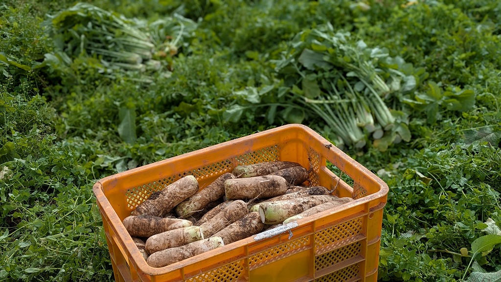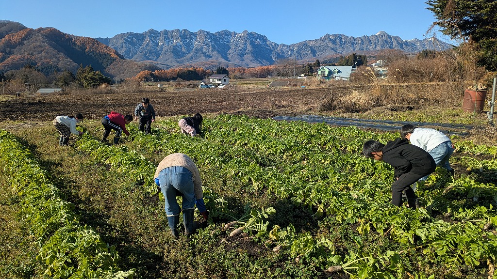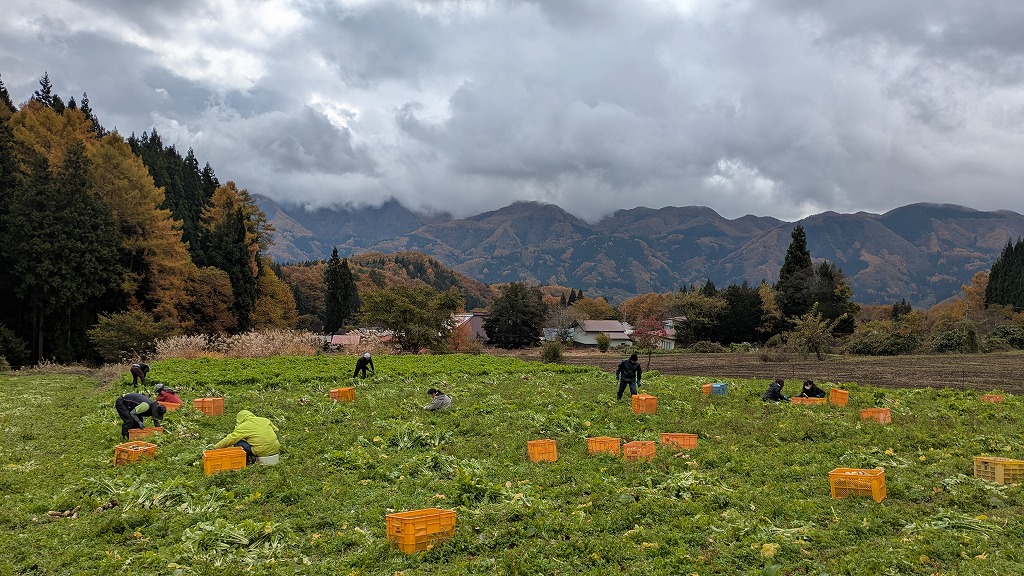 広い圃場での収穫作業は、戸隠大根を抜く人、葉を切る人、運搬車でコンテナを運ぶ人といったように分担して行いました。収穫作業は少ない人数で黙々とやると大変ですが、多くの人がいると話をしながら気分転換できるし、作業も目に見えて捗るのが分かるし、楽しい収穫作業となりました。