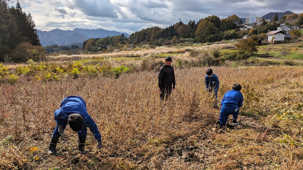 中学校では、大豆と戸隠大根の収穫を行いました。大豆の収穫では鎌で刈り取り、島立てして乾燥、その後に脱穀の作業となります。こちらも生徒が多く、また皆さん手際よく動いていたのであっという間に終わりました。