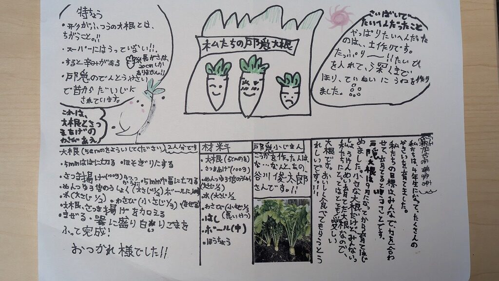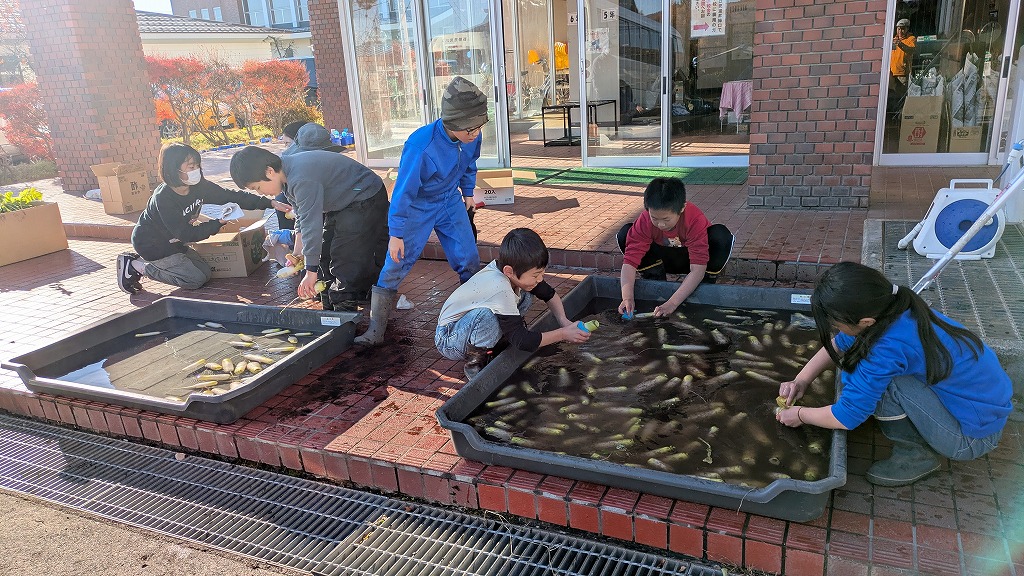 小学校では鞍掛豆と戸隠大根の収穫を行いました。生徒は、大根を抜く日を楽しみにしていたようで、あれよあれよという間に収穫作業が終わり、並行しての洗浄作業もとても手際よく行い、さらに収穫後には生徒が袋詰めと値決めして直接お客様に販売する。いい授業だなーと感心するとともに、私も一緒に作業することを通して大きな学びがありました。