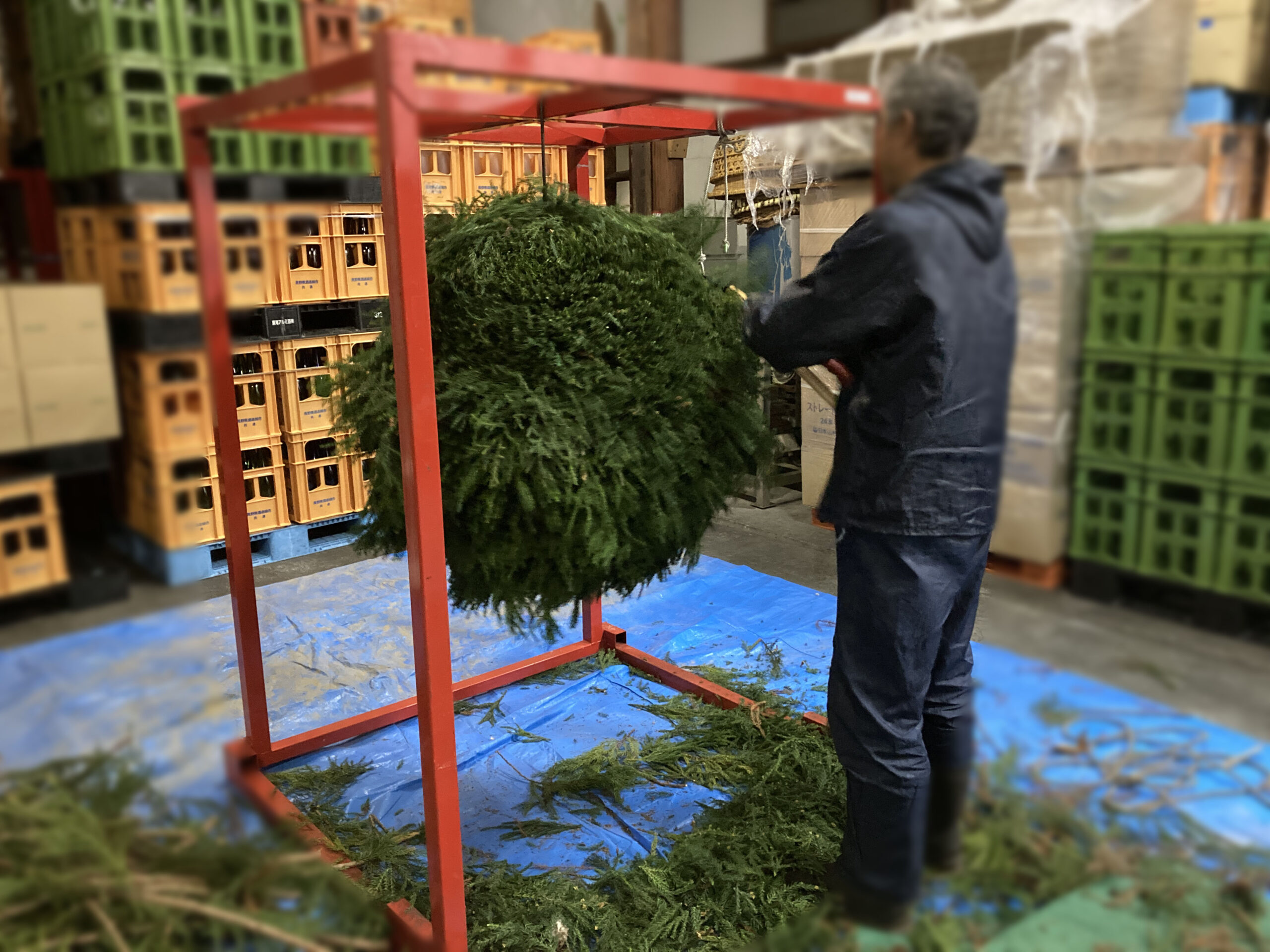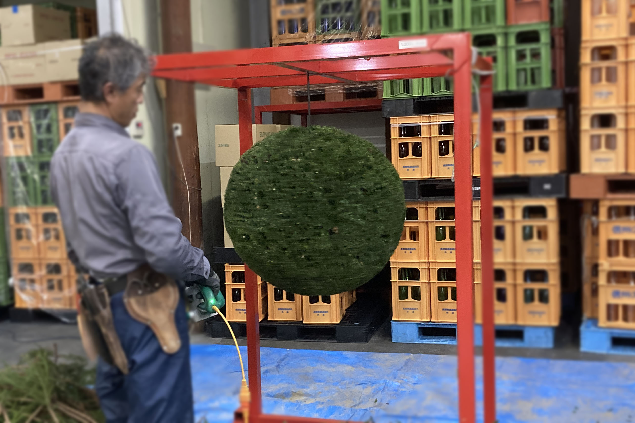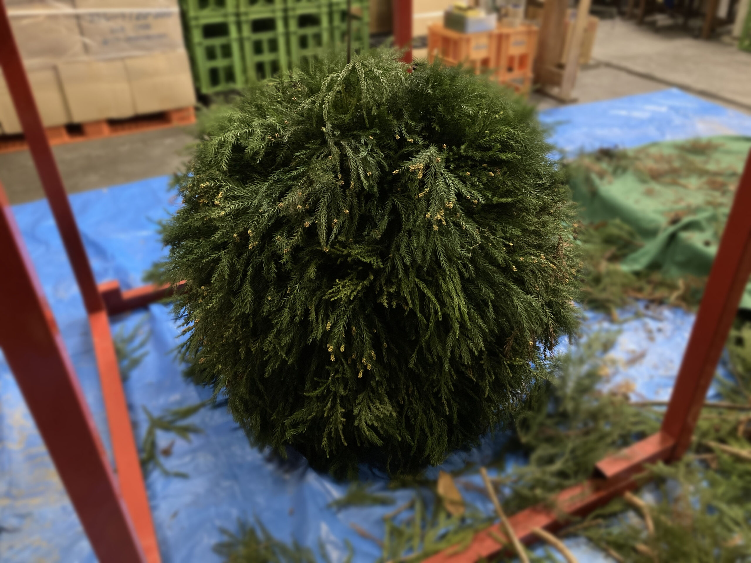 はみ出した枝を落とし、少しずつ「杉玉」の輪郭が見えてきます。