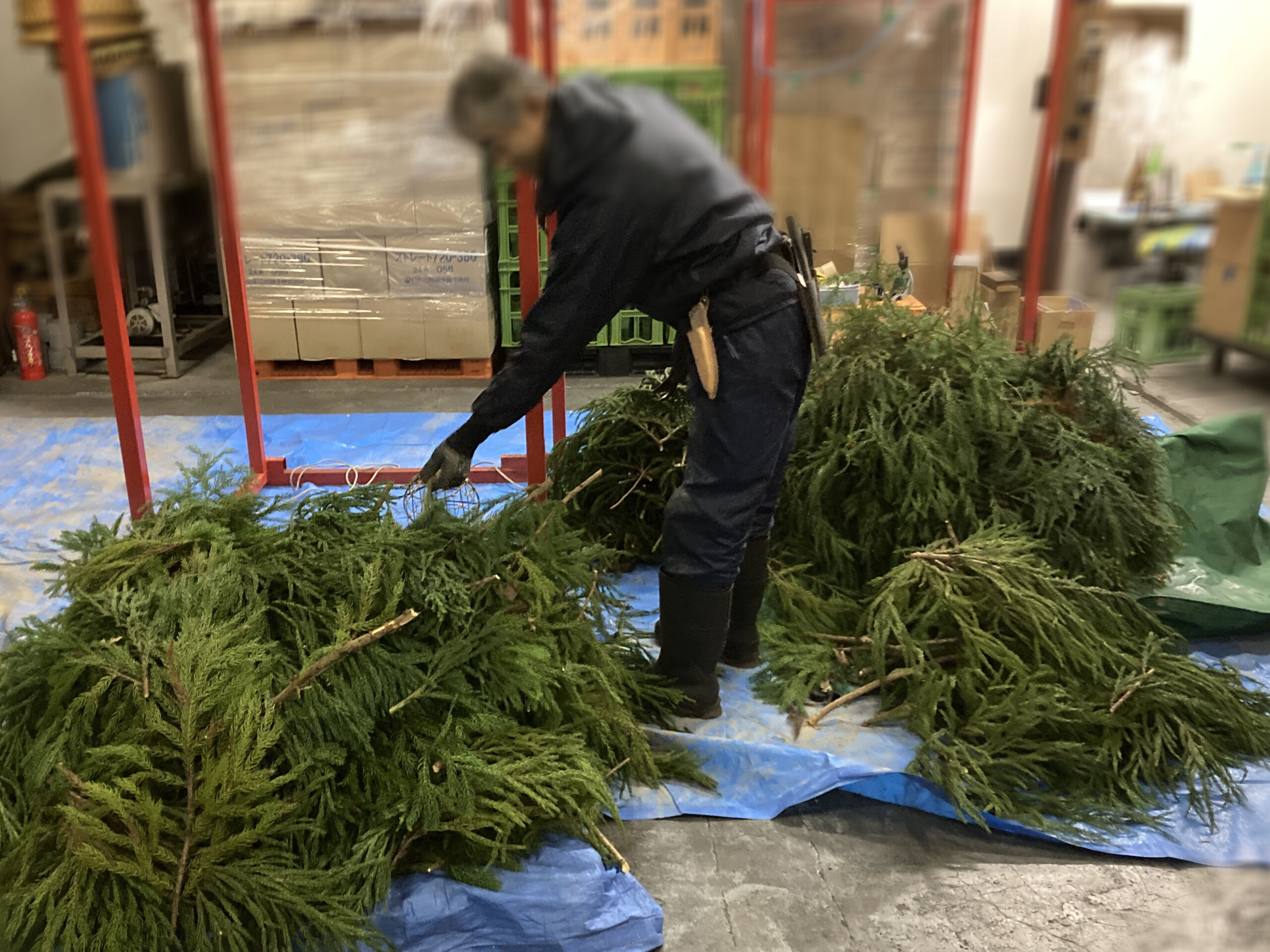 一本一本、香り高い杉の枝を集めるところから作業が始まります。
