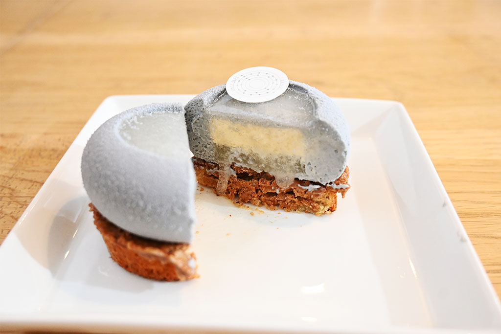 看板商品の一つ「コバルト」は、元素記号27番のコバルトから着想を得て生まれたケーキ。食用の竹炭パウダーでその輝きを表現したグレーの見た目が印象的で、中にはホワイトチョコレートとヘーゼルナッツのムース、グレープフルーツジュレが重なり合います。そこに土台生地のサクサクとした食感や、“スパイスの女王”カルダモンの甘くエキゾチックな香りが加わることで、異なる素材が調和するよう緻密に構成された一品に。ひと口ごとに表情を変える味わいは、水野さんが大切にする「素材の個性」と「独創性」の両方を感じられる、まさにパティスリー27でしか出合えないケーキです。