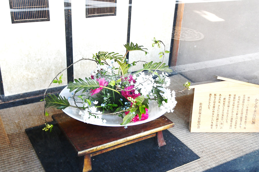 同店のすぐ近くにある老舗の和菓子店「かどや」の店頭の一角に、ガラス張りでミニチュアの和室のようなしつらえのスペースがあります。そこにはいつも季節の花が美しく生けられていて、信号待ちをするドライバーや町を歩く人の目を楽しませています。これは島田さんがライフワークのように、30年以上毎週生け続けている花飾りだそうです。